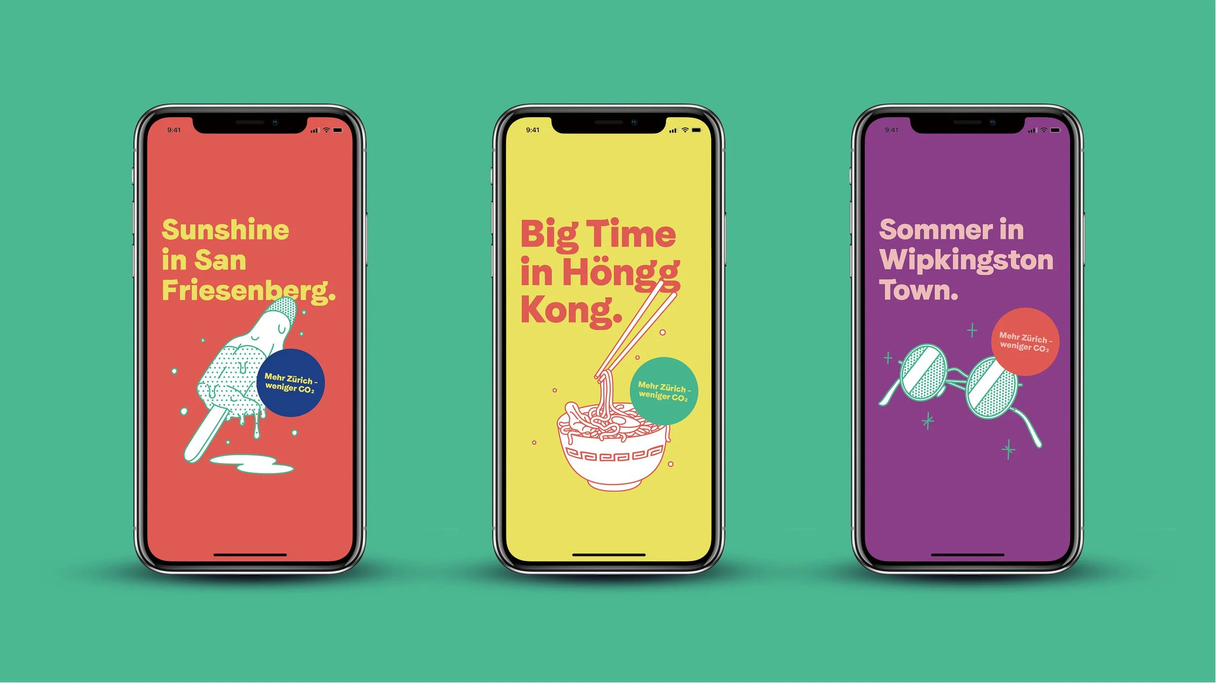 The city of Zurich launched an initiative urging its citizens to explore and appreciate their local spaces, with the overarching aim of reducing CO2 emissions. In order to effectively communicate this message to the public, we developed a dynamic and contemporary visual identity for the campaign.