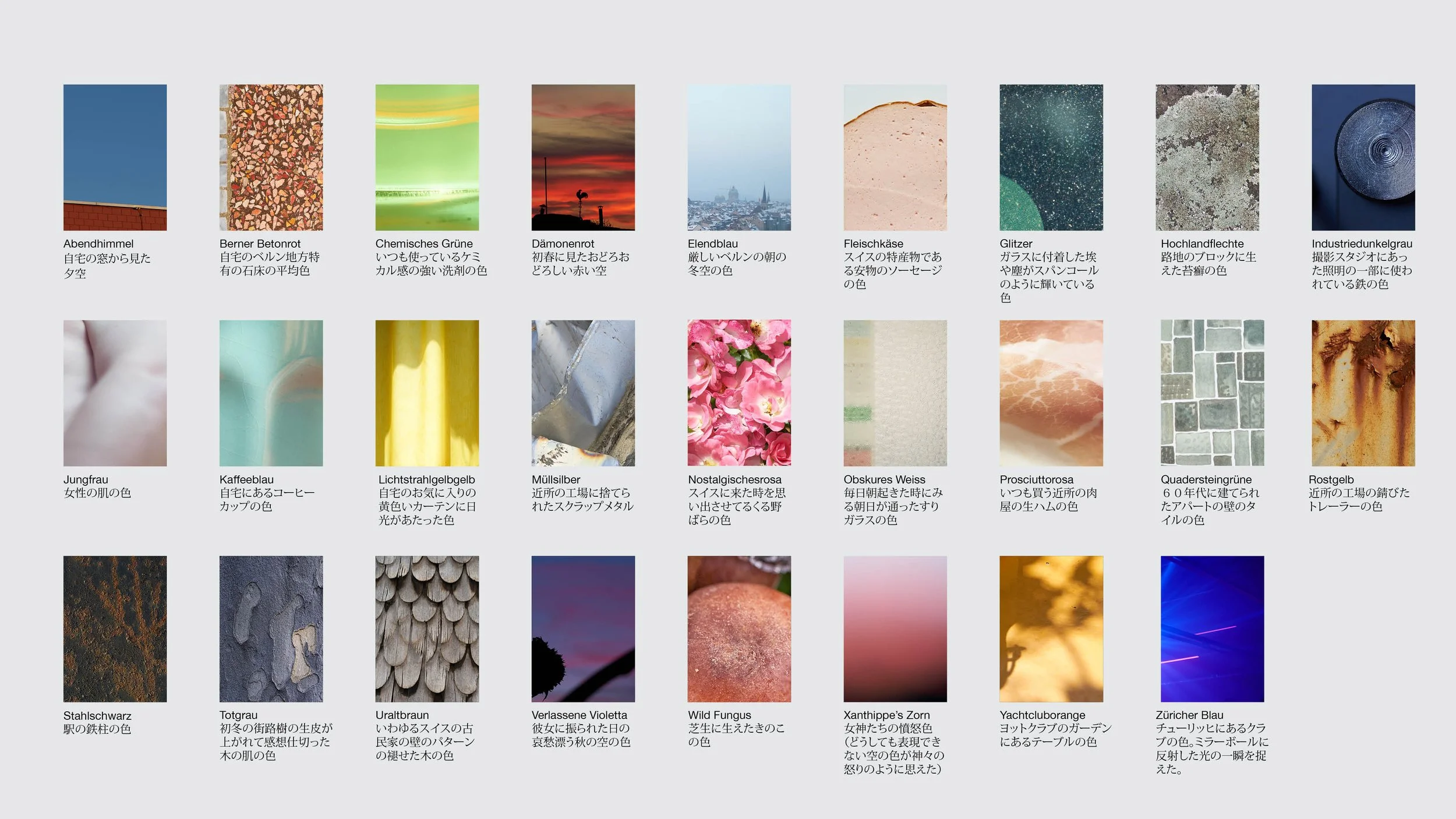 During my time in Switzerland, I conceived the idea of capturing the colors of everyday Swiss life and creating a color guidebook. From a multitude of colors observed through my personal lens of Switzerland, I meticulously selected 26 colors and assigned them unique names, arranging them alphabetically. When designing the book, I developed a "typeface" consisting of 26 shapes to serve as containers for the colors. This innovative "typeface," named FARBETICA, draws inspiration from the globally recognized Swiss typeface Helvetica and is specifically designed for reading colors.