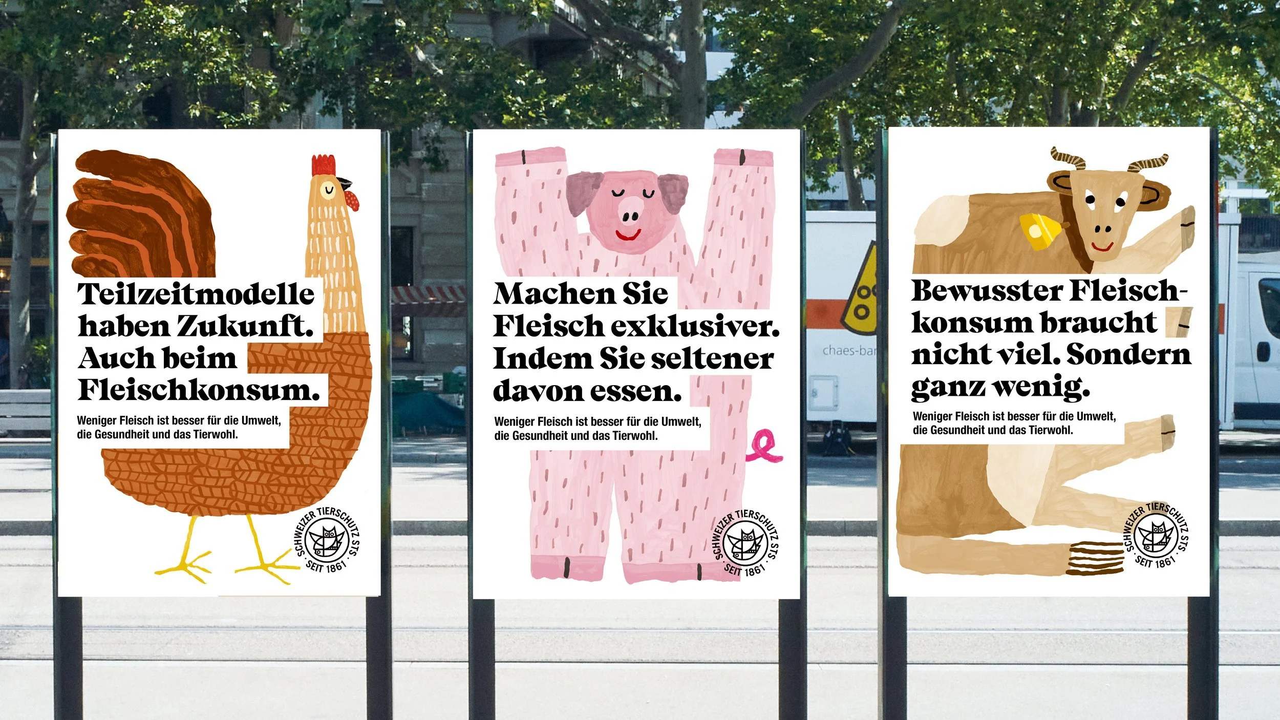 スイス動物福祉NPOの「食肉の需要を減らすことで動物の福祉につなげよう」というメッセージを伝える広告事例。クライアントの強い要望で、上から押し付けるような広告ではなく、食肉を禁ずるのではなく肉の消費量を減らしその代わりに質の良い肉を消費することで家畜の福祉に繋がるというメッセージを伝えるため、温もりあるポジティブな印象のイラストレーションを採用することで、聴衆の共感を図った。
