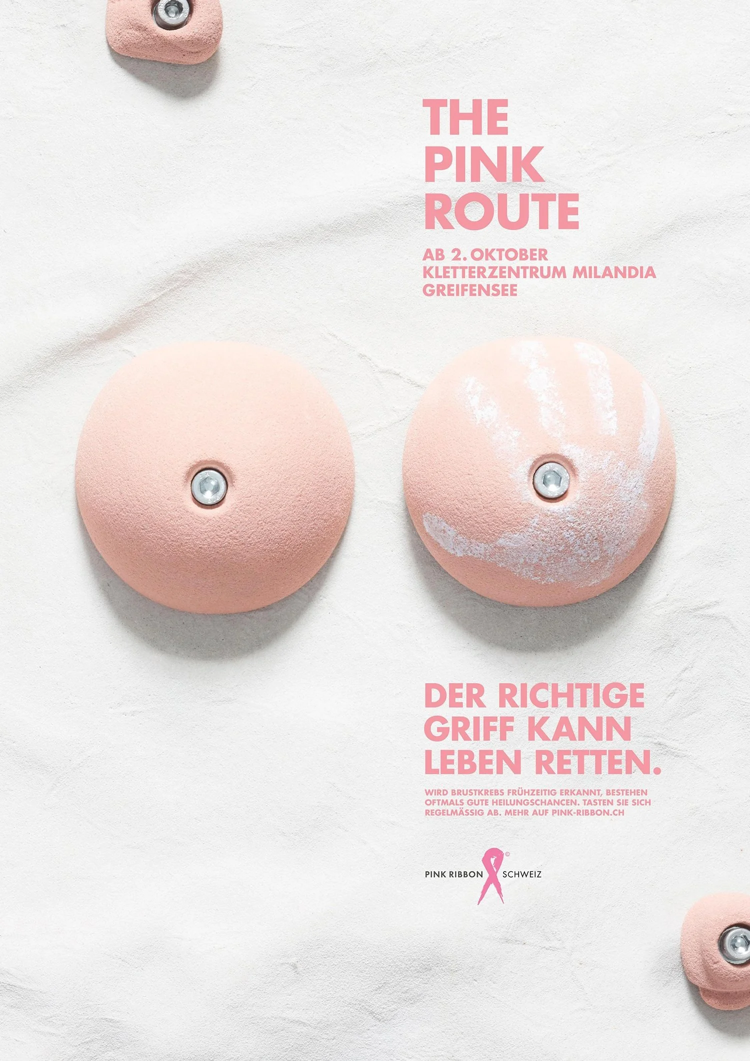 ピンクリボンスイス10周年記念の企画として「The right grip may save lives」というモットーの下、乳房を模したホールドで作られたボルダリングルート「The Pink Route」という特別ルートをボルダリング施設に設置し、女性にとって日常の乳癌触診は大変重要だというメッセージを提示した。施策は大成功を収め、各メディアプレスにも紹介され、さらには海を越え日本のテレビ番組でも紹介された事例。